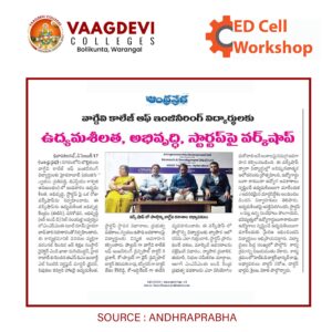 The Entrepreneurship Development & Startup Awareness Program was successfully conducted by the Entrepreneurship Development Cell (EDC) in association with the R&D Cell, Vaagdevi College of Engineering, in collaboration with MSME Tool Room, Hyderabad.